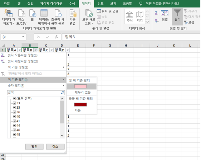 아래와 같이, 항목B의 화살표를 다시 한번 누르고, [색 기준 필터] - [셀 색 기준 필터] 에서 핑크색을 골라서 클릭한다.