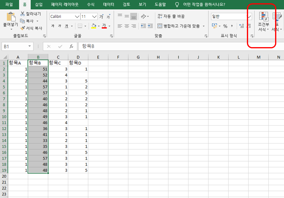 (2) 엑셀의 상단 메뉴에서 가장 좌측 [파일] 메뉴 오른쪽에 있는 [홈]을 선택한다. [홈]에서 [홈 - 조건부 서식] 버튼을 누른다.