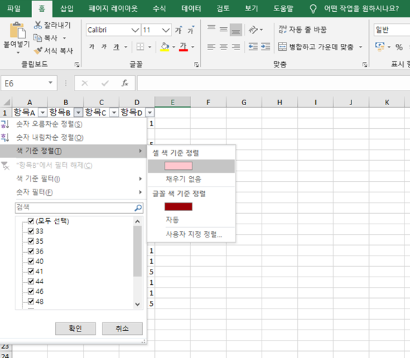 (7) 위와 같이 항목B라는 데이터에 대해서 중복 값을 확인했으므로, 이번에는 항목B의 아래쪽 화살표를 누르고, [색 기준 정렬] - [셀 색 기준 정렬] 에서 핑크색을 골라서 클릭한다.