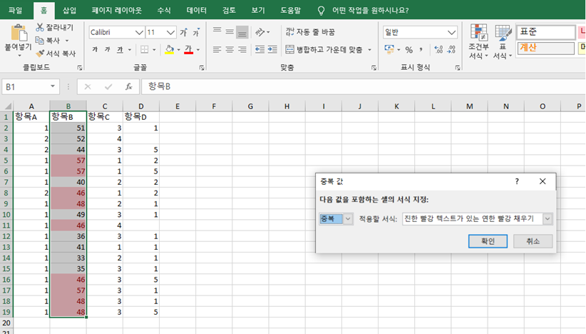 (중복 외에도 값의 크고 작음, 같음, 텍스트 포함 등의 조건으로도 표시가 가능한 것을 알 수 있다... 이 기능들은 다음에 다시 정리해야 할 것 같다... 다시한번 느끼지만, 엑셀의 기능은 정말 많다...엑셀만 잘해도 R이나 Python을 하지 않아도 왠만한 통계처리를 할 수 있다는 말이 있듯이...)