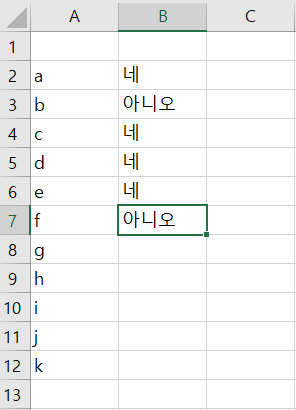 위와 같이 a부터 k까지 '네' 혹은 '아니오'를 입력해야 하는데