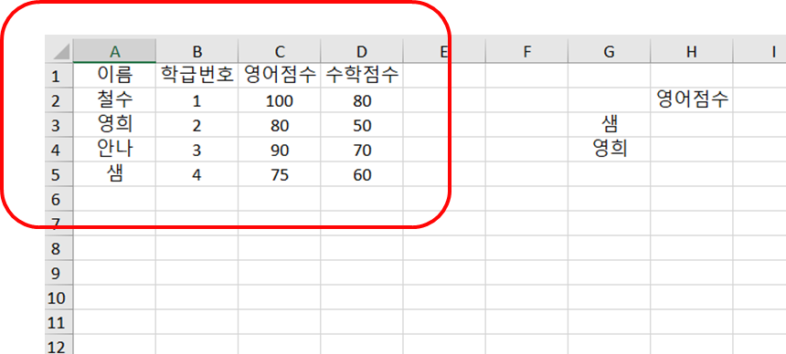 위에서 [영희]의 영어점수를 자동으로 입력하려고 할 때,