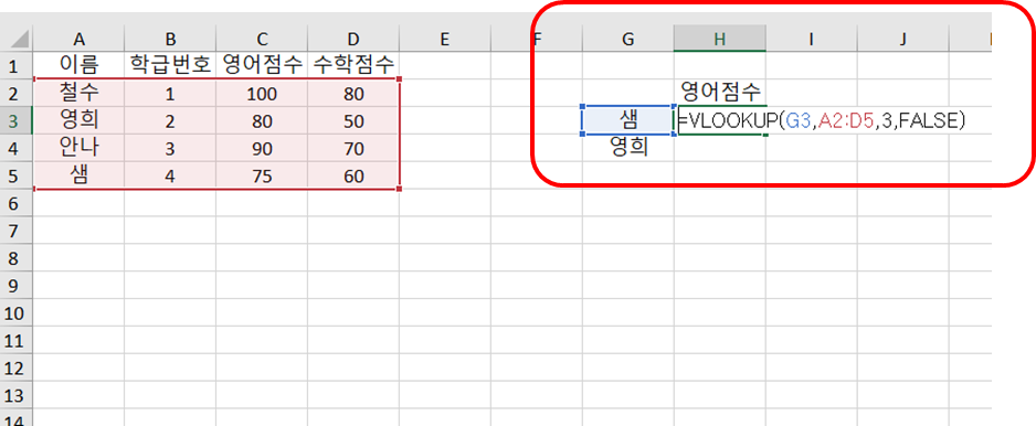 3) 가져올 값 : 3 (위의 A2부터 D5까지의 영역 중에서 가져오고 싶은 값이 있는 열이 왼쪽으로부터 몇 번째 열에 있는지, 영어점수는 영역 안에서 3번째 열이므로 3을 입력한다.)